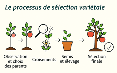 La sélection variétale est l’art (et la science) de choisir et croiser des arbres fruitiers pour obtenir de nouvelles variétés qui cumulent des qualités recherchées.